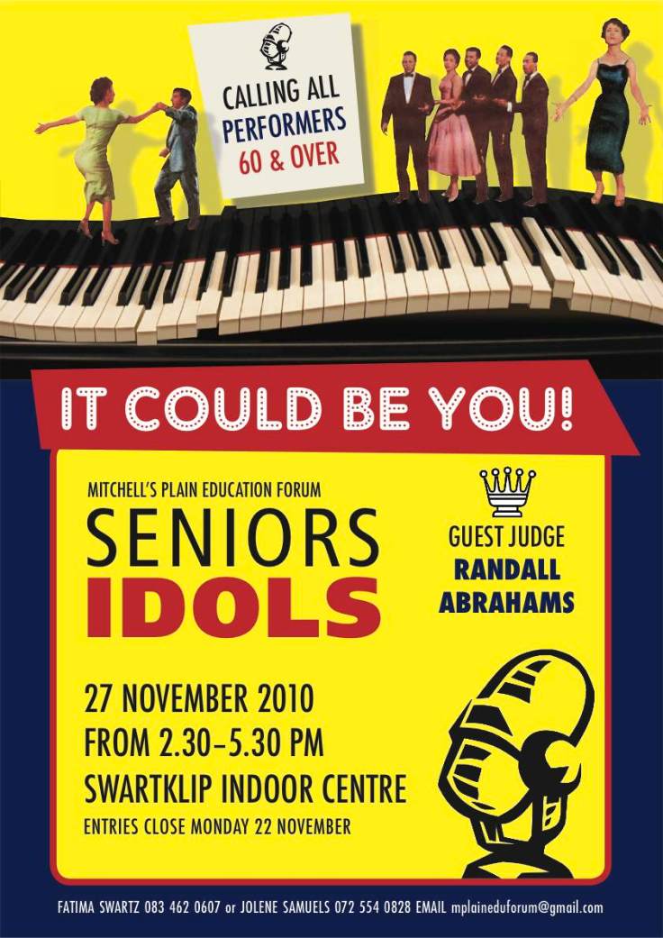 On Saturday, 27th November 2010, at the Swartklip Indoor Sport Stadium from 2:30pm – 5:30pm the Mitchell’s Plain Education Forum (MPEF) is hosting a “Seniors Idol High Tea with Randall Abrahams”