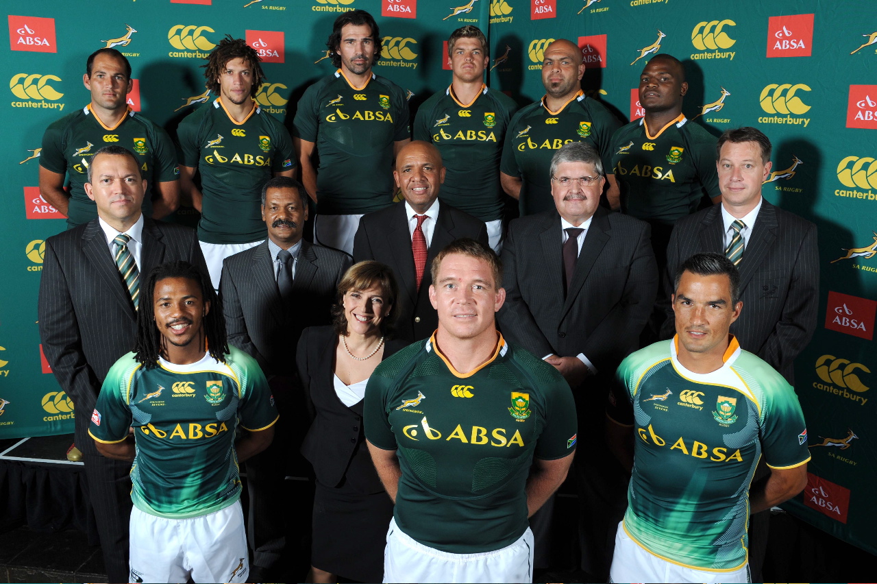 Back (left to right): Fourie du Preez, Zane Kirchner, Victor Matfield, Juan Smith, Gurthrö Steenkamp, Chiliboy Ralepelle. Middle: Oregan Hoskins (SARU President), Peter de Villiers (Springbok coach), Happy Ntshingila (Absa Chief Marketing and Communications Officer), Louis von Zeuner (Absa Deputy Group Executive), Jurie Roux (SARU CEO). Front: Cecil Afrika, Maria Ramos (Absa Group Chief Executive), John Smit, Neil Powell.