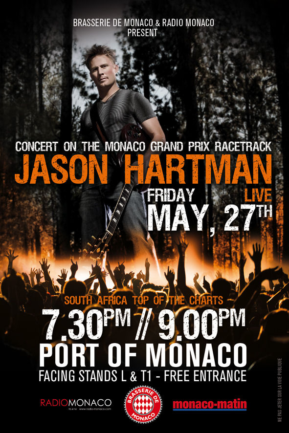 Johannesburg, 20 May 2011: 2009 Idols winner Jason Hartman will be performing on the Monaco Grand Prix Racetrack this Friday, 27 May 2011. Hartman, who soared to success with chart-topping hits such including Break The Silence and On The Run, will be performing two shows with his 5-piece band to thousands of people after Friday’s race.