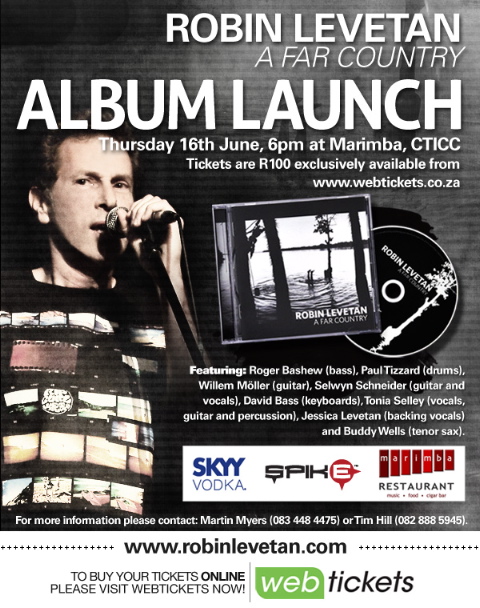 “A Far Country” – Robin Levetan album launch 16 June http://www.webtickets.co.za/event.aspx?itemid=3376152 http://www.robinlevetan.com Discover more from Martin Myers Subscribe to get the latest posts sent to your email. Type your emailโฆ Subscribe Share this: Click to share on Facebook (Opens in new window) Facebook Click to share on X (Opens in new window) X Click to share on WhatsApp (Opens in new window) WhatsApp Click to email a link to a friend (Opens in new window) Email More Click to print (Opens in new window) Print Click to share on Reddit (Opens in new window) Reddit Click to share on Pinterest (Opens in new window) Pinterest Click to share on Tumblr (Opens in new window) Tumblr Click to share on Pocket (Opens in new window) Pocket Like Loading... Related Leave a comment Cancel reply Δ