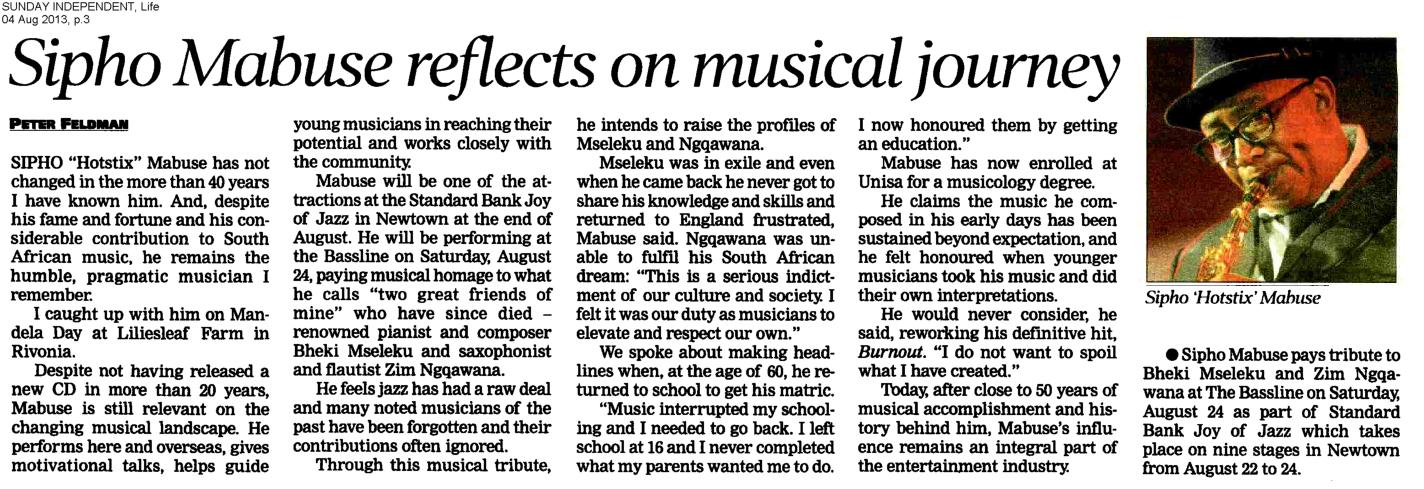 Sipho Mabuse Reflects On Musical Journey | Sunday Independent, Life, 4 August 2013 Discover more from Martin Myers Subscribe to get the latest posts sent to your email. Type your emailโฆ Subscribe Share this: Share on Facebook (Opens in new window) Facebook Share on X (Opens in new window) X Share on WhatsApp (Opens in new window) WhatsApp Email a link to a friend (Opens in new window) Email More Print (Opens in new window) Print Share on Reddit (Opens in new window) Reddit Share on Pinterest (Opens in new window) Pinterest Share on Tumblr (Opens in new window) Tumblr Share on Pocket (Opens in new window) Pocket Like Loading... Related Leave a comment Cancel reply Δ