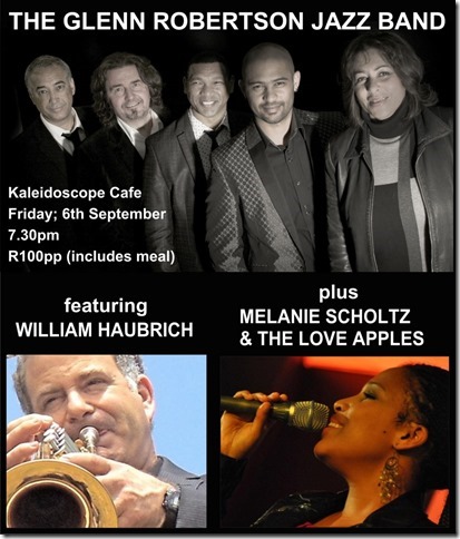 The Glenn Robertson Jazz Band featuring William Haubrich on Flugelhorn, Trumpet and Trombone PLUS Melanie Scholtz and The Love Apples will be performing live at Kaleidoscope (85 Main Road; Claremont – Above Tin-Roof).