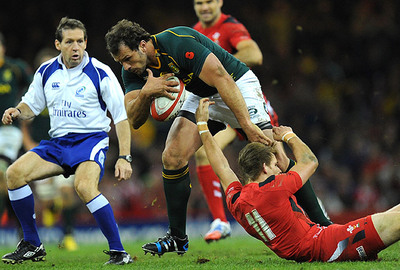 Wales were back in the game and the momentum was with them when Springbok opensider Francois Louw was yellow-carded for literally rubbing Wales hooker Richard Hibbard up the wrong way. An elbow to the face and then a fist pushed into the jaw looked worse on the big screen that it was, and with the crowd roaring their heads off as they saw the replay, referee Alain Rolland was probably influenced into reaching for the card when a penalty would have sufficed. Still, it was a needless series of actions by Louw, and it put his team under pressure.