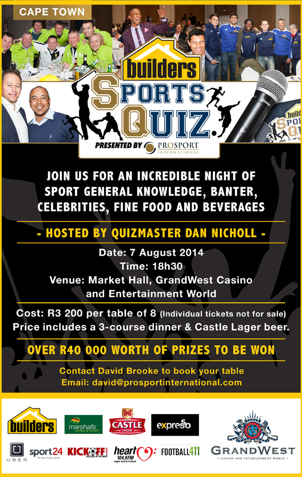 The Cape Town leg of the 2014 Builders Sports Quiz is set to take place at GrandWest Casino and Entertainment World on August 7