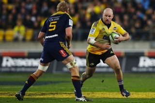 Hurricanes prop Ben Franks charges forward during the Super Rugby final.