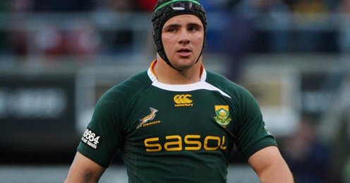 Position Name Franchise / Club Test Caps Test points 15 Willie le Roux Toyota Cheetahs 26 35 14 JP Pietersen Cell C Sharks 60 90 13 Jesse Kriel Vodacom Bulls 1 5 12 Damian de Allende DHL Stormers 4 0 11 Bryan Habana Toulon 107 285 10 Handré Pollard Vodacom Bulls 10 75 9 Ruan Pienaar (vice-captain) Ulster 81 135 8 Schalk Burger (captain) DHL Stormers 76 70 7 Francois Louw Bath 35 25 6 Heinrich Brüssow Toyota Cheetahs 20 5 5 Lood de Jager Toyota Cheetahs 10 10 4 Eben Etzebeth DHL Stormers 34 5 3 Jannie du Plessis Cell C Sharks 63 5 2 Bismarck du Plessis Cell C Sharks 71 45 1 Tendai Mtawarira Cell C Sharks 65 10 Replacements: 16 Adriaan Strauss Vodacom Bulls 45 25 17 Trevor Nyakane Vodacom Bulls 12 5 18 Vincent Koch DHL Stormers 0 0 19 Flip van der Merwe Vodacom Bulls 35 5 20 Warren Whiteley Emirates Lions 2 0 21 Cobus Reinach Cell C Sharks 7 10 22 Pat Lambie Cell C Sharks 41 106 23 Cornal Hendricks Toyota Cheetahs 11 25 Stats and facts: