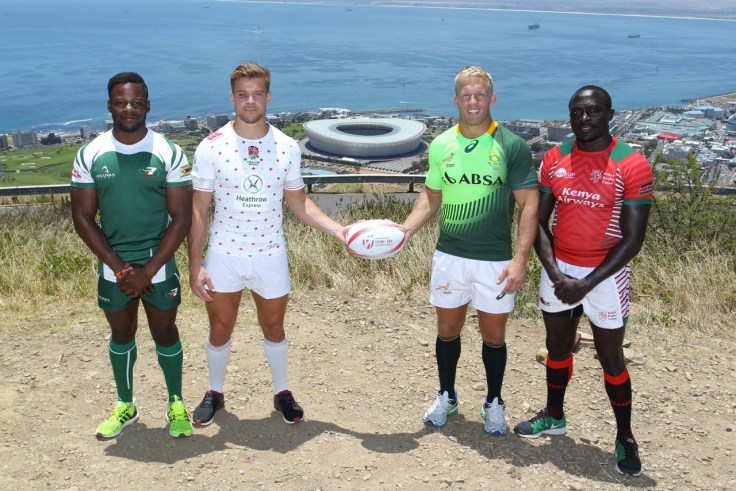 The captains of the teams in Pool B this weekend are (from left to right) Hilton Mudariki (Zimbabwe), Tom Mitchell (England), Kyle Brown (South Africa) and Collins Injera (Kenya) with the Cape Town Stadium in the background. Photo credit: World Rugby.