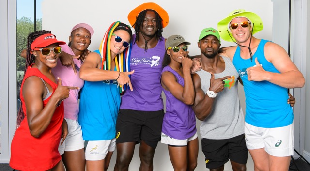 South African Sevens stars Veroeshka Grain, Nomsa Mokwai, Marithy Pienaar, Tim Agaba, Phumeza Gadu, Sandile Ngcobo and Ruhan Nel model a brand new range of HSBC Cape Town Sevens gear that will be on sale for the first time ever at this year’s tournament.