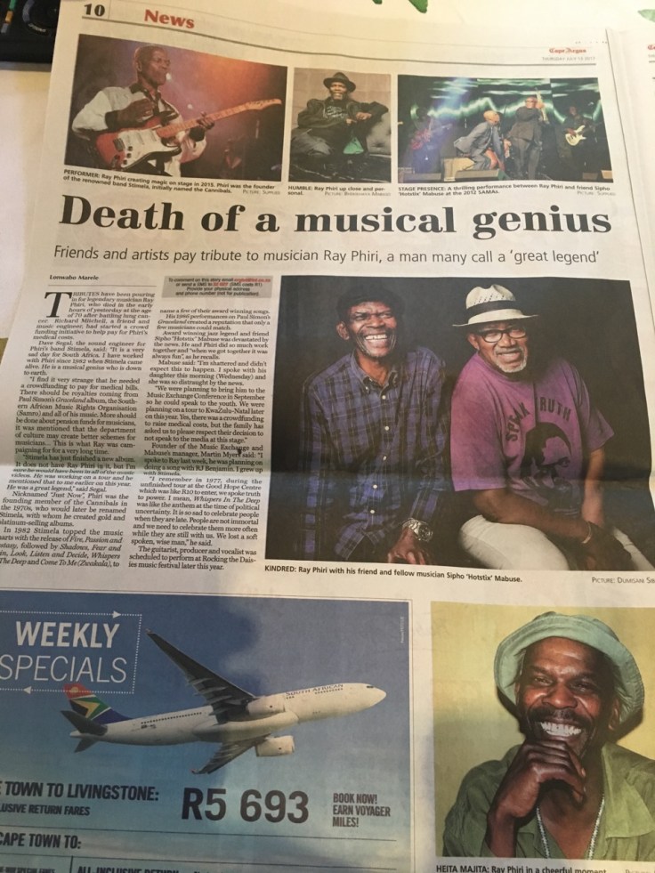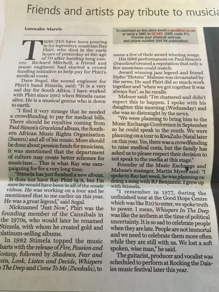 Rest in peace my friend Ray Phiri – I know you are at peace – I remember the Unfinished Story so well when I was at UCT and the lifelong friendship we developed .A giant friend has passed – I will not whisper in the deep .