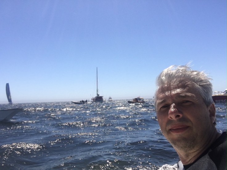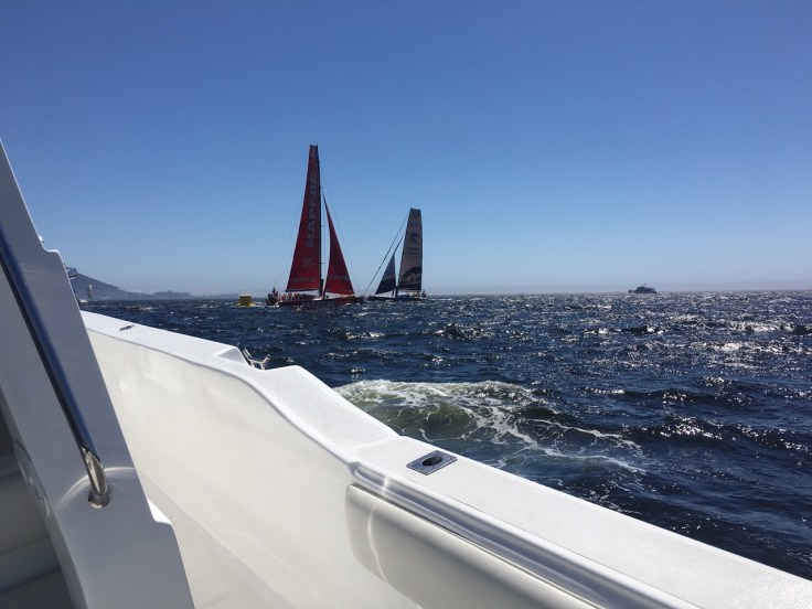 These magnificent racing beasts did over 19 knots as a gentle SW breeze blew over Table Bay .A flotilla of media boats and small rubber ducks followed the action.