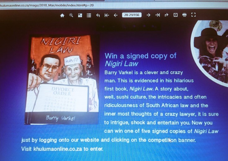 Nigiri Law is an easy read and even the current issue (March 2018 ) of the inflight magazine for Kulula has 5 copies to give way ..