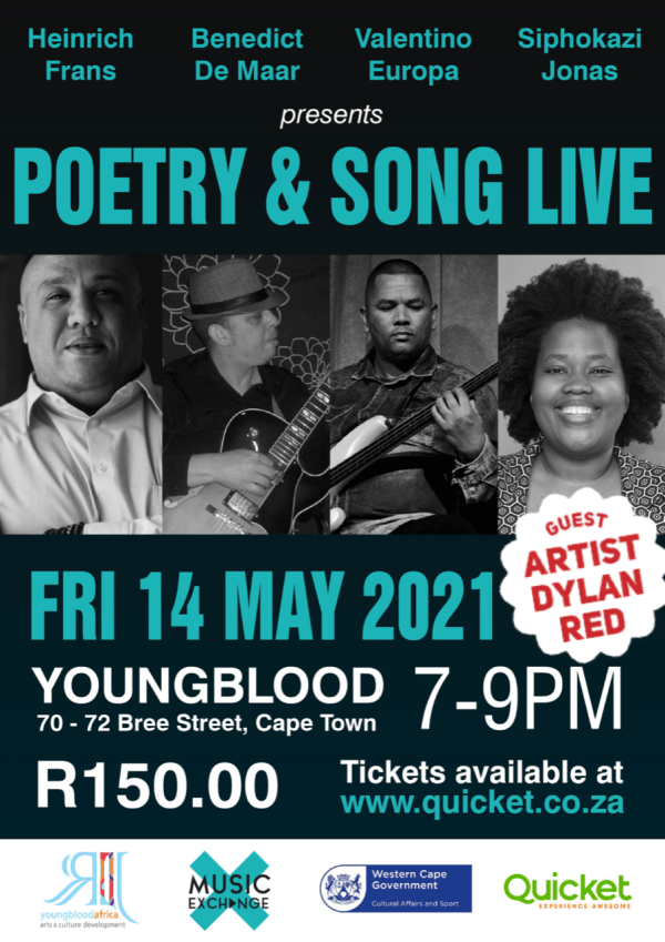 A special evening of Poetry and Song with the inimitable Siphokazi Jonas, Dylan Red, Heinrich Frans, Benedict De Maar and Valentino Europa. https://www.youtube.com/watch?v=il2cYCqqHUI