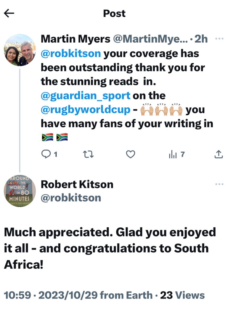 In my humble opinion Robert Kitson is one of the best, if not the best rugby writer along with Marc Hinton in NZ and Mike Greenway in SA (who self published his new book). It is a coffee table book “The Fireside Springbok” – in all book stores now.