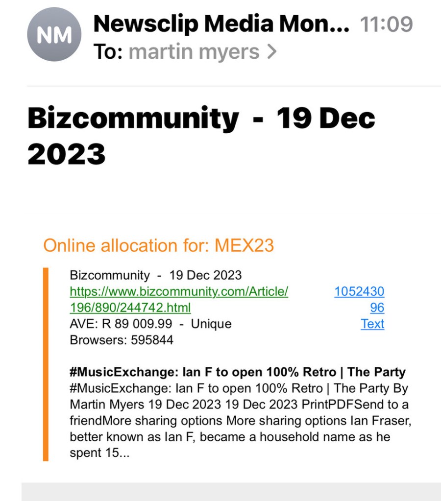 The work has a staggering media value as measured by NewClip and superb audience reach. See below R89K (A.V.E Advertising Value Equivalent )
