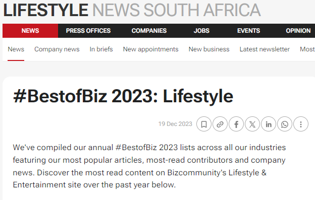 So happy to be the Most-read contributor on Bizcommunity’s Lifestyle & Entertainment portal for 2023.