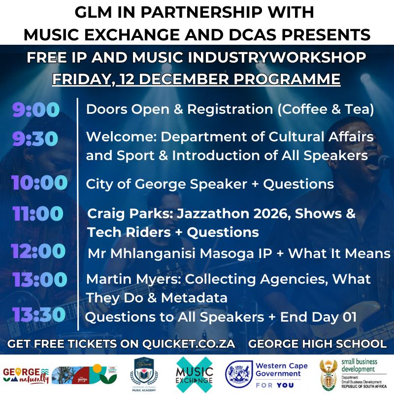 Artists, musicians, podcasters, producers, writers, designers, filmmakers, content creators and all creative professionals across the Western Cape are invited to an unmissable opportunity: a completely FREE, two-day IP & Music Industry Workshop hosted at George High School on 12 and 13 December.
