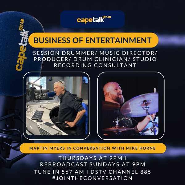 CapeTalkโs The Business of Entertainment features drummer Mike Horne, sharing his journey from South Africa to global recognition, airing Thursday and Sunday at 9 PM.