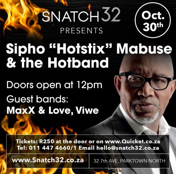 Please do join - Look at this fantastic line-up on 30th October from 12 noon https://www.quicket.co.za/events/150608-sipho-hotstix-live-at-snatch32/